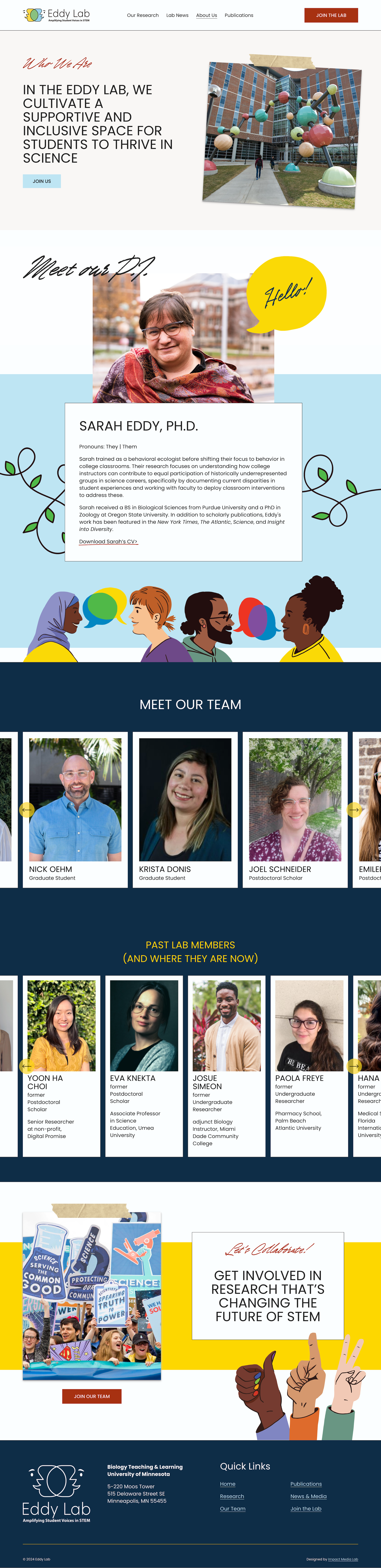 Sarah gravitated towards designs that had a human touch: hand-drawn illustrations and whimsical font that communicated professionalism and advocacy. Sarah is also a comic book lover, drawn to images that spark your curiosity and instill powerful messages. I worked with Dr. Eddy to create a brand and website that communicated their inclusive environment to prospective students and established public credibility for their research.