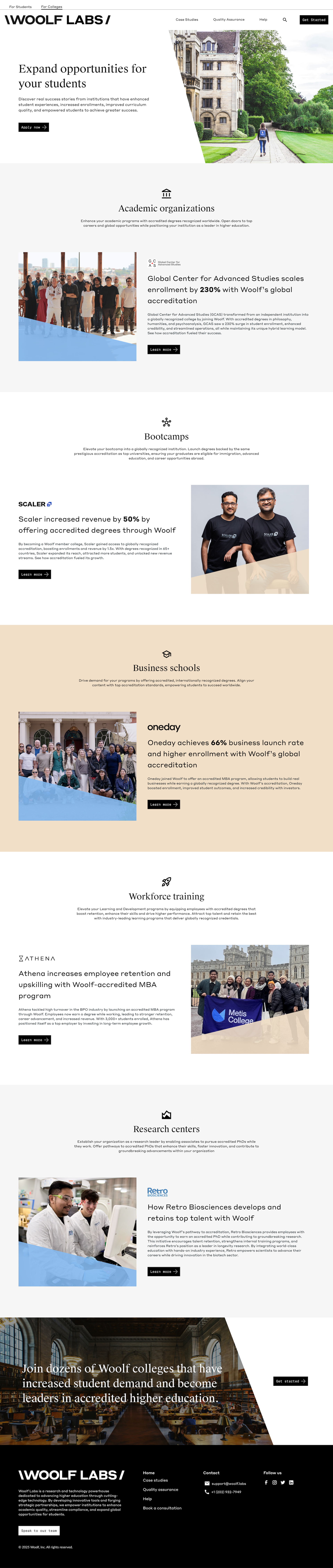 Woolf Labs needed a website that would highlight their commitment to excellence and cutting-edge accreditation technology, key differentiators from their competitors. I created a website design aligned with Woolf University's branding. The design helped Woolf Labs establish its distinct identity while visually conveying its dedication to quality and excellence.